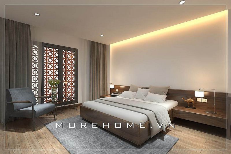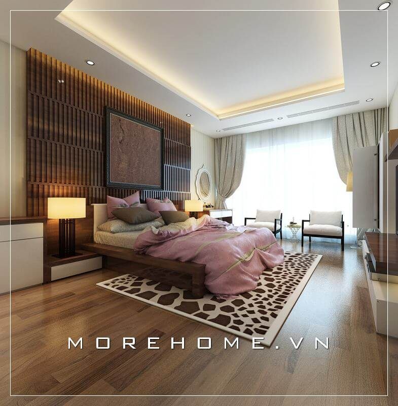 Giường ngủ biệt thự kiểu dáng hiện đại, tone màu nâu trầm nhẹ nhàng tạo nên cảm giác ấm áp và thoải mái cho người nằm
