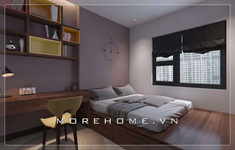 Giường ngủ gỗ công nghiệp với gam màu nâu gỗ nhẹ nhàng, thanh thoát kết hợp hộc tủ phía dưới màu trắng tạo cho không gian thêm ngăn nắp, gọn gàng hơn