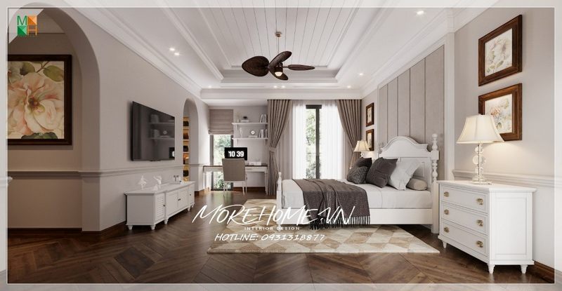 Mẫu thiết kế nội thất phong cách tân cổ điển bằng gỗ tự nhiên sơn trắng mang lại sự sang trọng cho các phòng ngủ của căn hộ, nhà phố và biệt thự.
