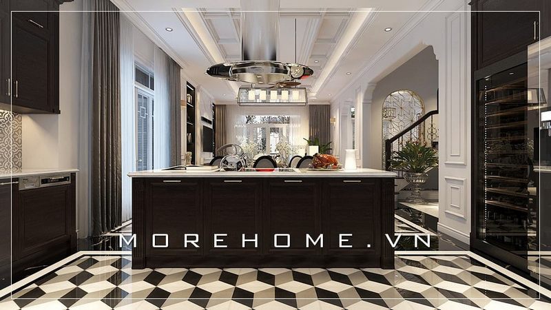 Mẫu bàn đảo bếp gỗ tự nhiên, mặt bàn ốp đá màu trắng giúp người nội trợ tiện nghi trong công việc nấu nướng đồng thời tạo vách ngăn giữa phòng bếp và phòng ăn