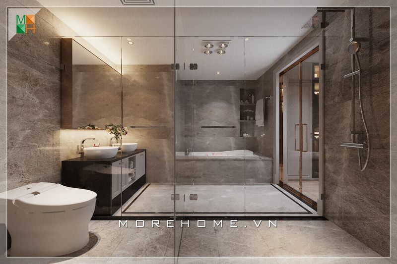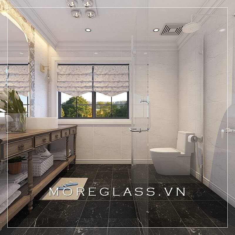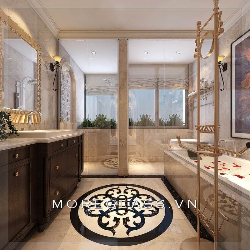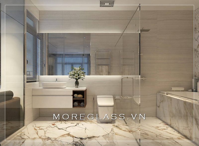 Việc sử dụng cửa sổ lớn hoặc kính trong suốt không chỉ tạo cảm giác rộng rãi mà còn mang lại nguồn ánh sáng tự nhiên, biến phòng tắm thành một không gian thư giãn lý tưởng. Những mẫu gạch lát, vật liệu kính trong suốt cùng màu sắc nhẹ nhàng kết hợp tinh tế, giúp không gian thêm phần sang trọng và hiện đại.