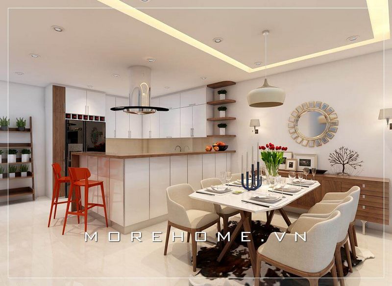 Thiết kế phòng ăn và phòng bếp liền kề nhau, bàn ăn được đặt giữa không gian thiết kế khá đơn giản với 6 chiêc ghế Grance bọc nệm và chiếc bàn với mặt bàn được làm bằng đá nhân tạo Ơđẹp mắt| ấn tượng}