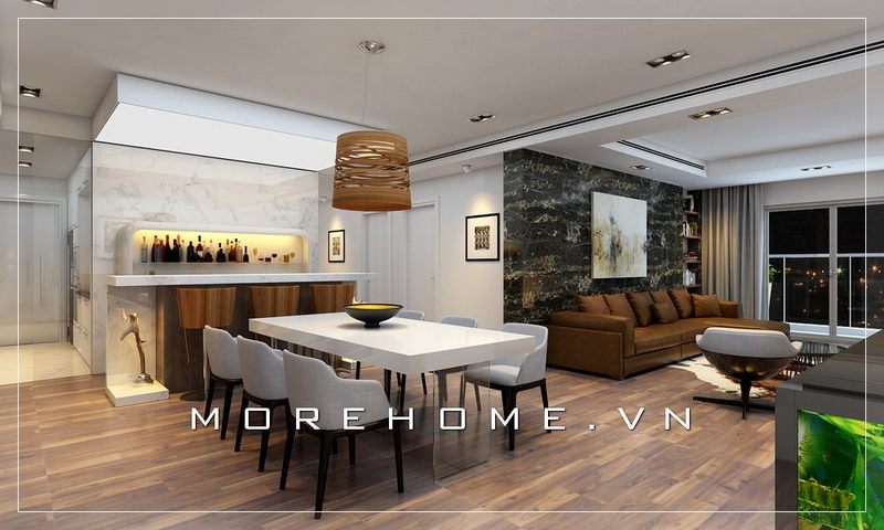 Mẫu bàn ăn gỗ hiện đại, bàn ăn mặt đá màu trắng ấn tượng kết hợp với ghế gỗ bọc da màu ghi tạo nên sự hài hòa cho phòng ăn chung cư